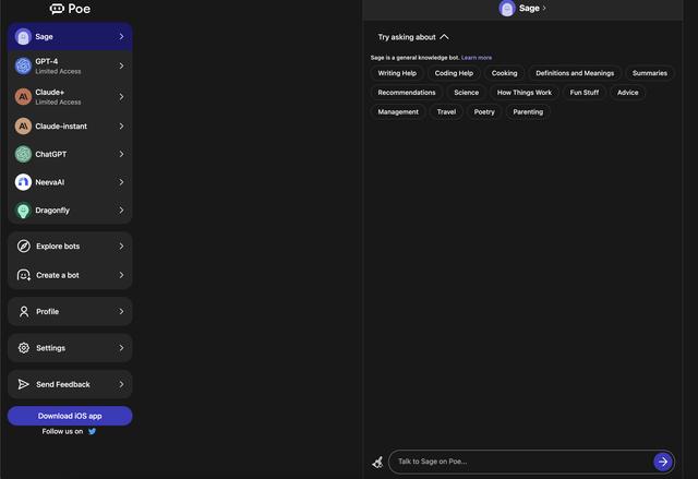第三个工具就是Poe,Poe可以让我们在同一个页面里面,可以使用到包括gpt4在内的很多不同的大型语言模型,这个就好像一个大型语言模型的一个聚合站点,基本上市面上的大型语言模型好像都可以体验。如果你在左侧选择GPT4,你就可以马上和这gpt聊天了,当然如果你想体验其他的语言模型也是一样的操作,点击就可以进行对话,但是如果你使用gpt4的话,一天只能使用一次,上一个还是5次呢,这个只有一次,但起码体验gpt4的同时,我们也可以玩一下其他的语言模型。其他的语言模型是不限次数的。