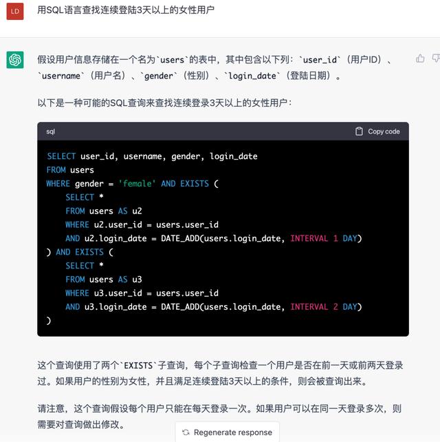 总结:简单的说对于SQL任务,告诉GPT你要做的事情,他就会模拟字段给出相应的代码,需要注意的就是AI虽好,但是错误也不少!还是要自己测试一下的。