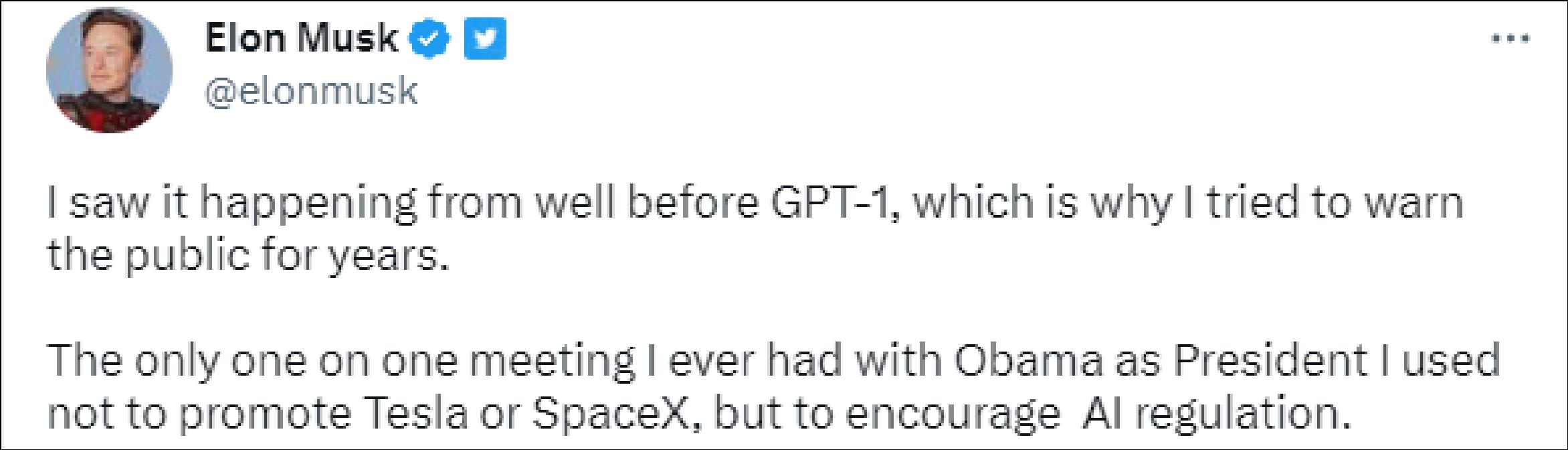 “我与奥巴马总统只有过一次会面,这并不是为了推广特斯拉或SpaceX,而是为了呼吁对AI的监管。”