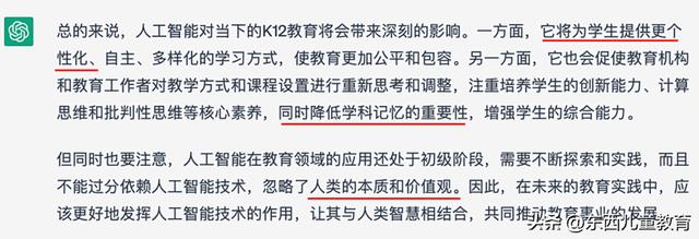ChatGPT的回复简短、稳重,有几个关键词值得细品:学生的个性化,降低学科记忆重要性,人类的本质和价值观。