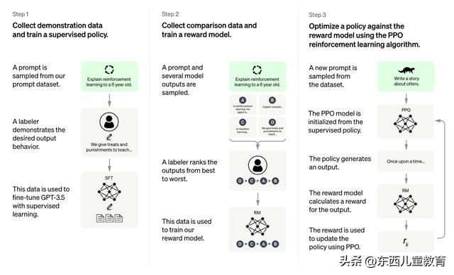 - 第三步:“根据奖励模型,对有监督模型进行持续的优化”,就是迭代重复前两步,让AI输出的文本越来越符合人的认知。