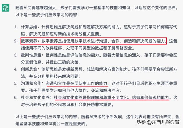 ? 关于孩子们要学什么,ChatGPT更强调思维能力和一些软技能的重要性。