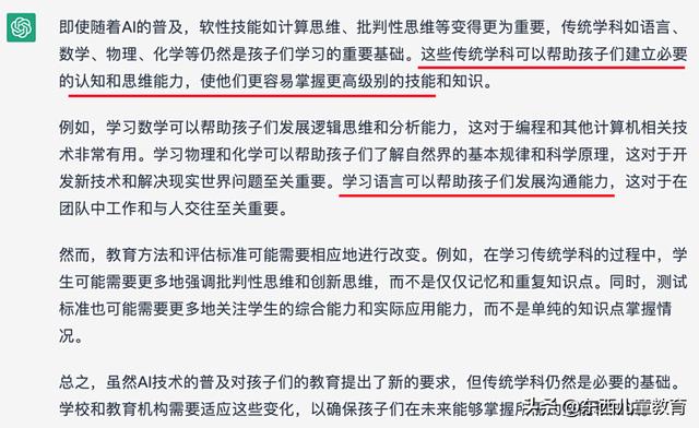 ChatGPT对传统学科教育的价值看得很清楚,那就是打基础,认知和思维能力的基础,沟通和社会交流的基础。