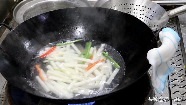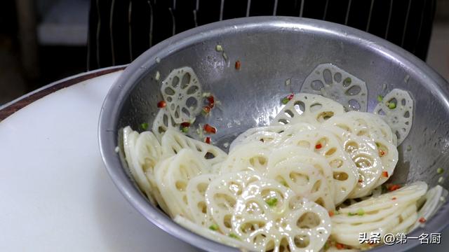 2.起锅烧水加入少许白醋,这样可以使藕片更加清脆亮白,水开后,下入藕片,用勺子不停地翻动,焯水1分钟,倒入漏勺中控水拔凉。