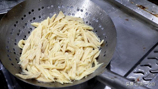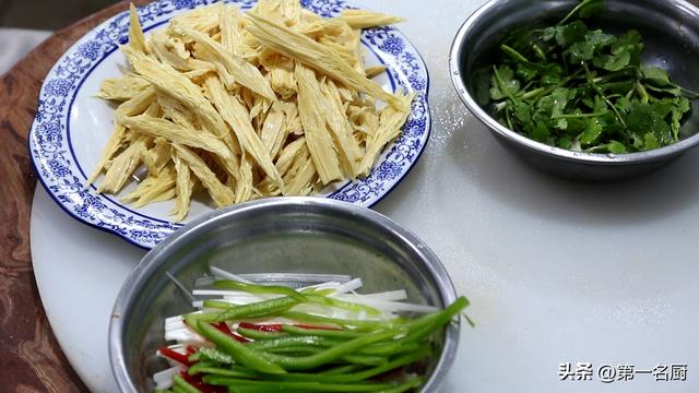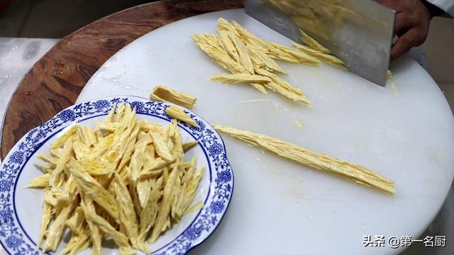 1.准备腐竹一把,提前用温水泡开,然后捞出控水切成斜片,放入盘中备用。