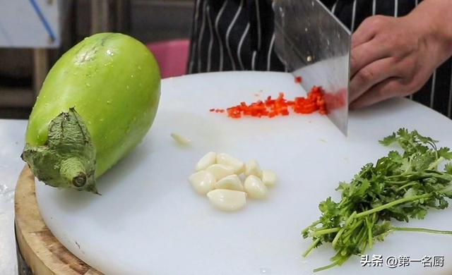 1.准备青茄子一个,洗净后备用,青椒半个去瓤,切成小粒,红椒半个去瓤也切成粒,香菜一小把切成小段,用刀把茄子从中间切开,分成两半备用。