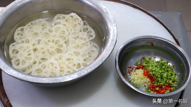 1.莲藕一节削去外皮,切成均匀的薄片,放入盆中,倒入清水浸泡2分钟,生姜1小块切成姜末,红椒半片切成红椒粒,青椒半片同样切成粒,一起放入盆中用来配色。