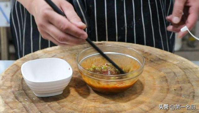 3.在蒸茄子的这段时间,取一个蒜臼子,放入几粒大蒜,加入一勺食盐,捣成蒜泥,加入少许芝麻油,加入二十克生抽,十克香醋,用筷子搅拌化开,倒入料碗中再加入红油五克,放入青红椒粒拌匀即可。