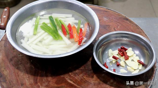 2.青椒半片去瓤,切成长条,和山药放在一起,红椒半个同样切成条,大蒜3粒切成蒜片,再抓入几粒红辣椒备用。