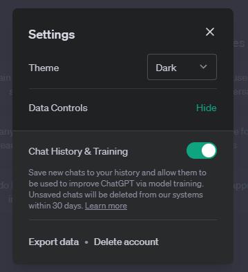 IT之家 4 月 26 日消息,OpenAI 最近为其人工智能聊天服务 ChatGPT 增加了一些新功能,让用户可以更好地保护自己的隐私。用户可以在 ChatGPT 的设置中选择关闭“聊天历史和训练”,以及导出自己的数据。