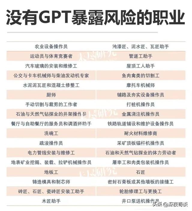 当然了,还有一些工作,更不是ChatGPT 能替代的工作——都是 20 年前自动化和大型制造业替代的工作。比如农业设备、厨师、洗碗、屠宰、管道检测、木制品切割、铸造模具、铺路、石油天然气勘探……