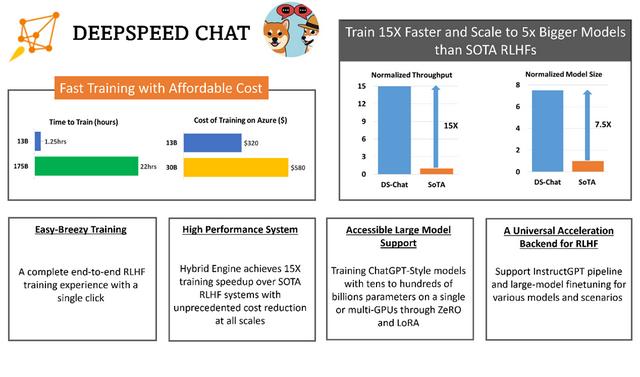 3. 高效性和经济性:可将训练速度提升15倍以上,并大幅度降低成本。例如,DeepSpeed-HE若在Azure云上训练一个OPT-30B模型,仅需18小时、花费不到300美元。