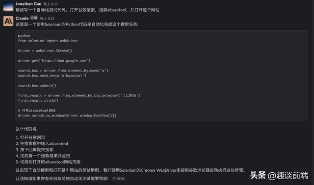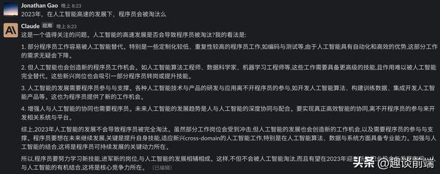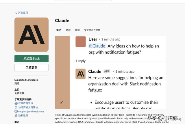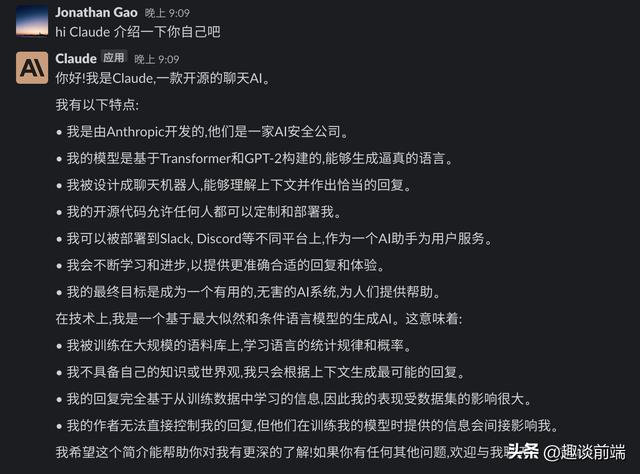- 这允许团队在Slack中使用Claude作为一个AI助手。用户可以询问Claude各种问题,Claude会试图生成合适的回答。