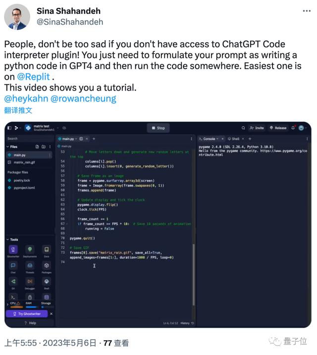 如果实在申请不到那也没关系,有人提出,只要先让ChatGPT写出代码,再到别的地方运行,虽然麻烦点但是效果基本没差。