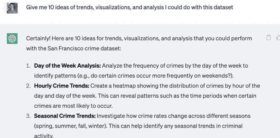 作者首先上传一个CSV格式数据集,然后问ChatGPT都能怎么分析或处理这些数据,给出10条建议。