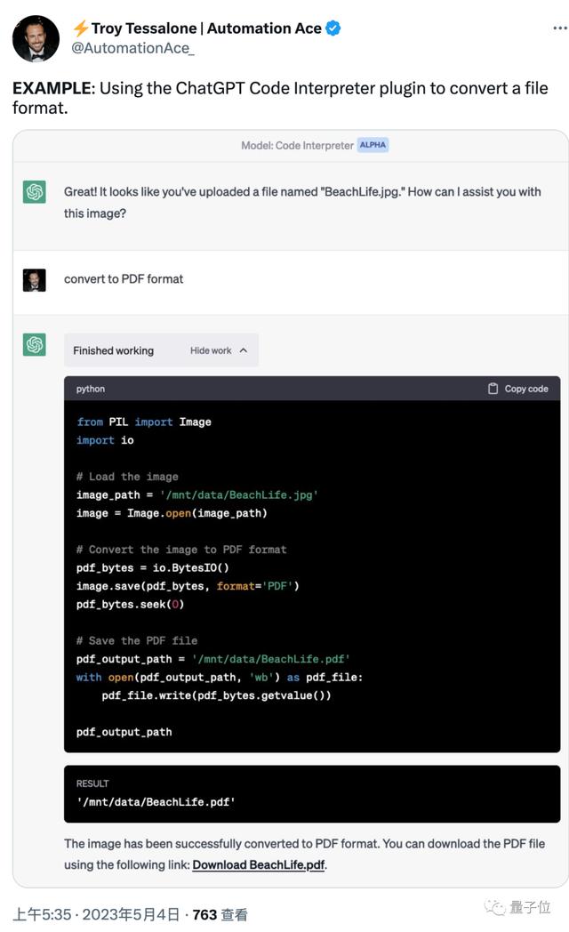 有人上传一张图片,让ChatGPT转换成PDF,对于其他格式,只要Python有对应的库理论上都可以。