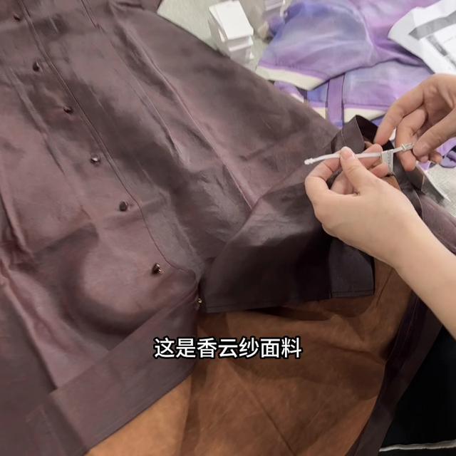 这个是10姆米的乔其,一个厚一点的薄吗?轻飘飘的,清透。对对对,就是很仙女的那种感觉很仙。它的这个纹理感很强的,工艺上还是很难的对比(其它面料)。对,它有专门的针,就比较偏最小,最小号的针,线也是最细的线,专门匹配它的针线都是不一样的。它线非常的细腻你看看,它是来去缝!对,来去缝,做工也是一点,做工很好,非常好。对,它不能用的靠边,靠边它就显得很低。来去缝的话所有的问题都解决了。冠乐绉跟其他工艺有什么不一样,它有凹凸感,对,它有纹理感。对,还有它的舒适度。洗涤方式也是稍微比那个薄的要好一点,它其实还是比那个轻薄的要厚多了。对,19姆米阿