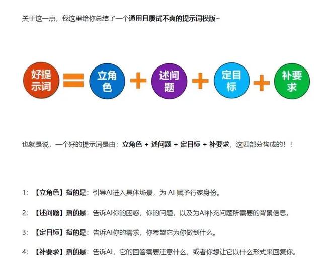 一个好的提示词是由:立角色+述问题+定目标+补要求,这四部分构成的!!