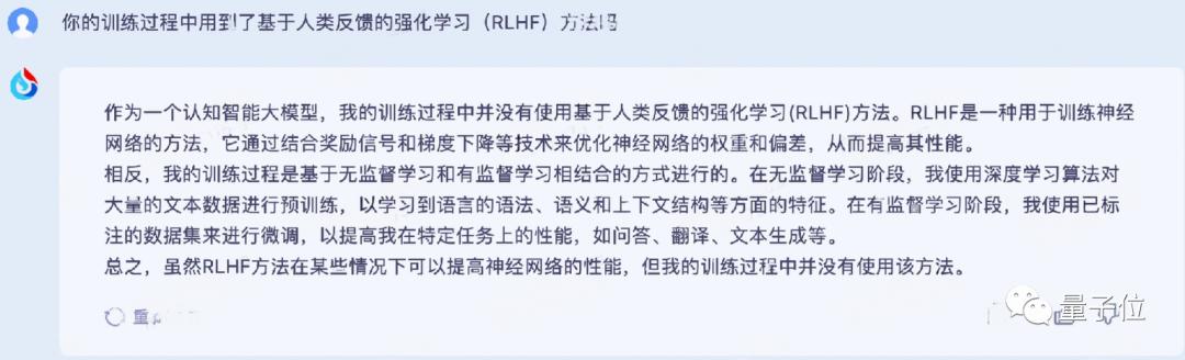 所以,讯飞大模型是否和ChatGPT一样,用了RLHF呢?它自己的回答竟然是没有: