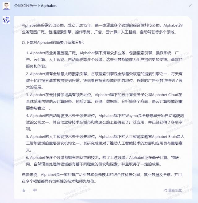 如果我想写一篇与谷歌有关的分析报告,那么通义千问至少能帮我省下十分钟以上的基础信息查询和归纳时间。