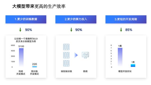 大模型带来了更高的生产效率:一是更少的训练数据。预训练开发模式可以把训练数据量减少90%;二是更少的算力投入,通过端到端训练和微调,算力投入可以减少90%;三是更短的开发周期。模型开发时间可以下降85%,从1周缩短到1天。