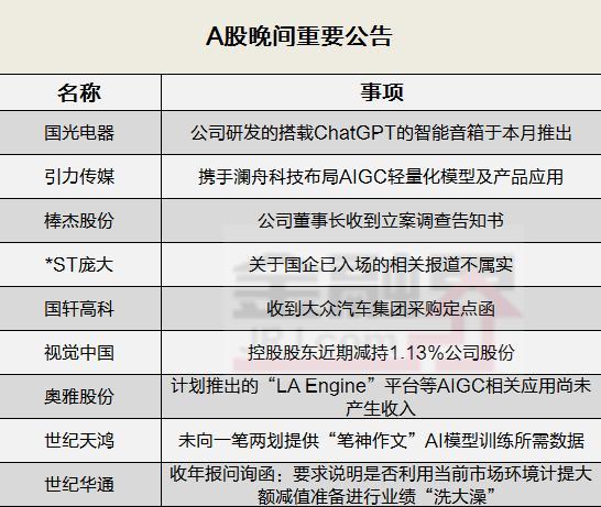 金融界5月10日消息 今日晚间重要公告抢先看——国光电器:公司研发的搭载ChatGPT的智能音箱于本月推出;引力传媒:携手澜舟科技布局AIGC轻量化模型及产品应用;棒杰股份:公司董事长收到立案调查告知书……