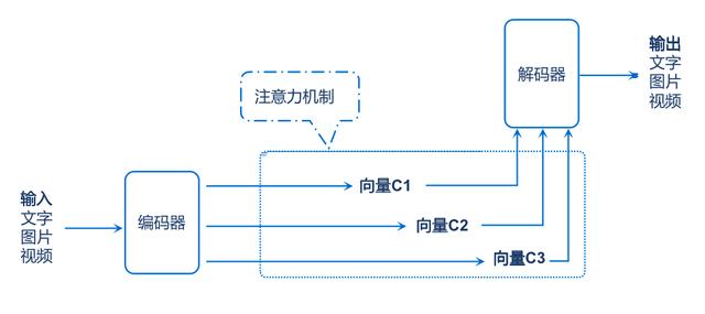直到2017年,谷歌发表“Attention is All You Need”的论文,提出将“Attention”(注意力机制)应用到Seq2Seq中,形成一种新的算法框架“Transformer”(变换器),不再将整个输入序列编码为固定长度的中间向量C,而是编码成一个向量的序列(向量C1,向量C2,……,向量Cn),同时采用于并行模式取代串行模式,从而改进了“信息丢失”和“效率低下”这两个缺陷,参见下图4。