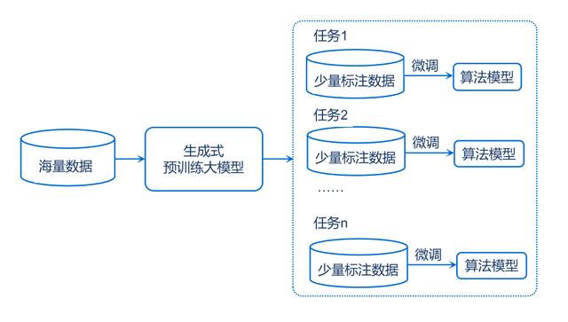 而预训练“大模型”,是指最开始时并不针对某一个特定任务,而是在更为广泛的通用原始数据(无需进行人工标注)上进行无监督学习,得到一个通用基础模型。应用过程中,再针对特定任务,通过适当少量的人工标注数据进行有监督学习,即微调,以得到解决特定任务的算法模型。同时,通过各类任务的应用反馈再迭代升级基础通用模型,进一步增强模型的鲁棒性和泛化应用能力。如下图6所示。