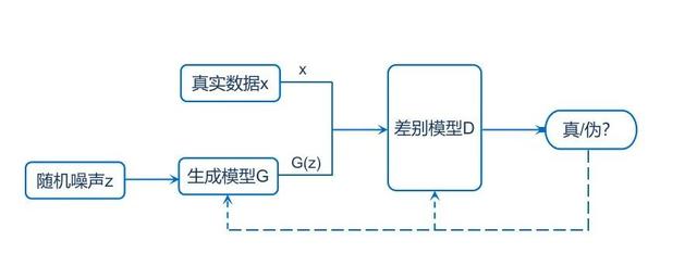生成式对抗网络GAN也是一种深度学习模型,由著名的深度学习理论专家伊恩·古德费洛(Ian J. Goodfellow)于2014年提出。一个GAN是由一个生成模型G和一个判别模型D构成。生成模型捕捉真实数据样本的潜在分布,并由潜在分布生成新的数据样本;判别模型是一个二分类器,判别输入是真实数据还是生成的样本。这两个模型交替训练,即生成模型不断学习生成更逼真的数据,判别模型则不断区分假数据和真实数据。直至判别模型已经无法判别是真还是假,生成模型G便形成。如下图2所示。