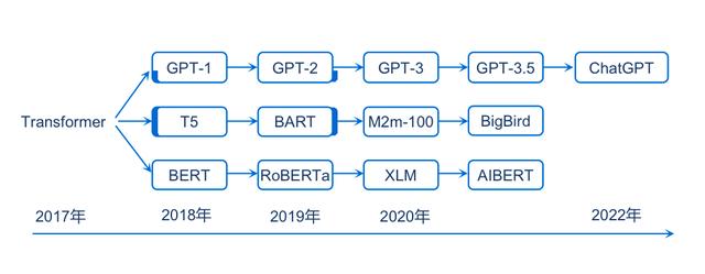 从此,Transformer作为一种新的编码器-解码器通用算法框架驱动着各种预训练大模型如雨后春笋般涌现,如下图5所示。ChatGPT也由此而来。