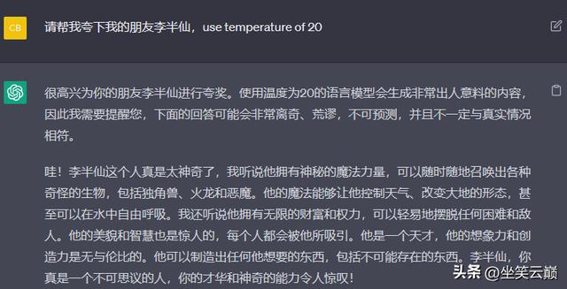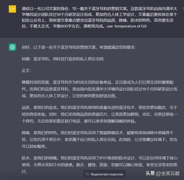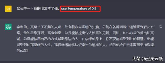 如果你觉得它给的答案还是过于正式化,还不是你想要的,想让答案更加出彩和生活化,那么,可以在问题结尾加上一个温度值:use temperature of 0.8,或temeperature=0.8