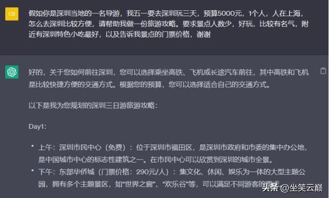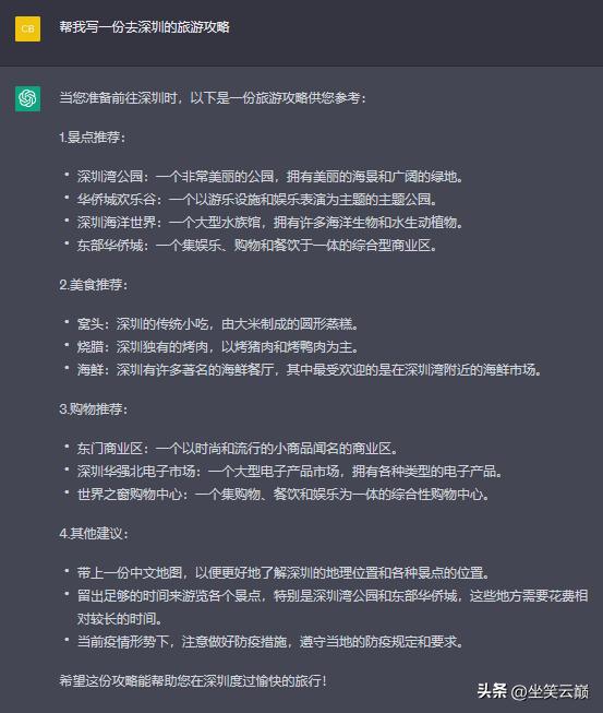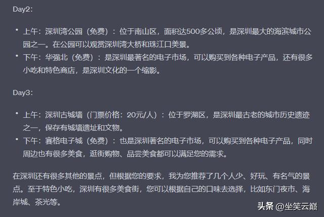 我的提问很简单,只是让它做一份旅游攻略,没有任何附加条件,它给我的答案比较笼统,简单的景点介绍+美食推荐+购物推荐。