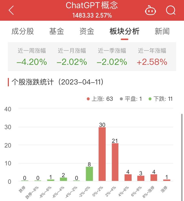 中国经济网北京4月11日讯 今日,ChatGPT概念板块整体涨幅2.57%,其中63只股票上涨,1只股票平盘,11只股票下跌。