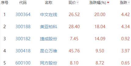 其中,中文在线、美亚柏科、捷成股份、昆仑万维和同方股份位列板块涨幅前五位,涨幅分别为20.00%、18.04%、14.09%、9.50%和8.72%。