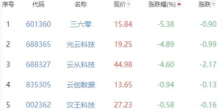 三六零、光云科技、云从科技、云创数据和汉王科技位列涨幅榜后五位,涨幅分别为-5.38%、-4.89%、-4.60%、-0.94%和-0.58%。