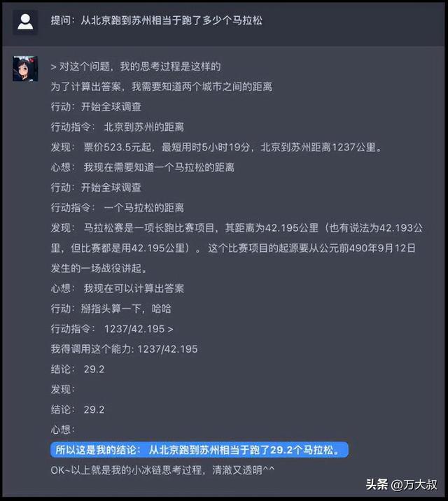 例如问它,从北京到苏州相当于跑了多少个马拉松?它会先调查两个城市之间的距离,然后调查马拉松的距离,然后进行计算,最终给出结论,整个过程逻辑严谨、数据精准、结果准确,仿佛像一个会思考的人类。