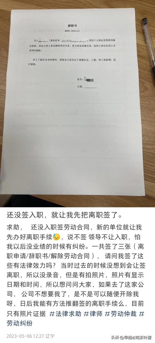 求助, 还没入职签劳动合同,新的单位就让我先办好离职手续,说不签 领导不让入职,怕我以后没业绩的时候有纠 纷。一共签了三张(离职申请/辞职书/解除劳动合同), 请问我签了这些有法律效力吗? 当时过去的时候没想到会让签离职,所以没录音,但是有拍照片,照片有显示日期和时间,所以想问问大家,如果去了这家公司, 公司不想要我了,是不是可以随便开除我呀,日后我能有方法推 翻签的离职手续么,目前只有照片证据。