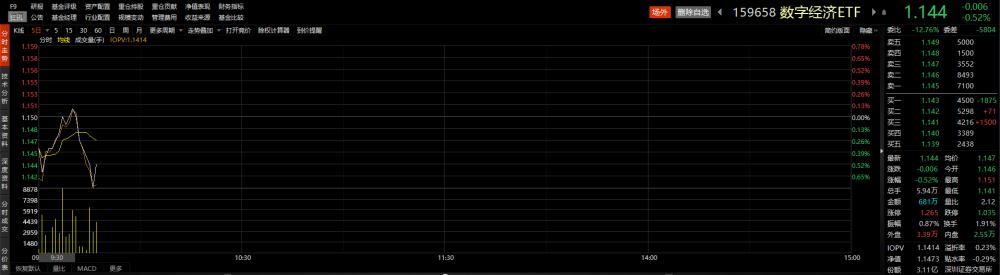 科大讯飞为数字经济ETF(159658)第4大成分股。数字经济ETF(159658)早盘震荡,截至发稿时下跌0.52%,盘中频现溢价,溢折率为0.23%。成交量持续活跃,换手率达1.91%。