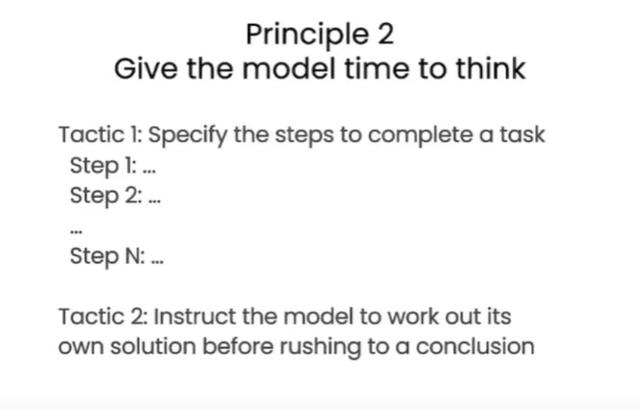 其次,给模型一些时间来思考是非常重要的。如果模型在短时间内或者几个字内完成任务,可能会导致错误的结果。因此,你应该指示模型在提供最终答案之前进行连续或系列的相关推理。你还可以要求模型自己解决问题,然后再比较其解决方案与学生的解决方案是否一致。