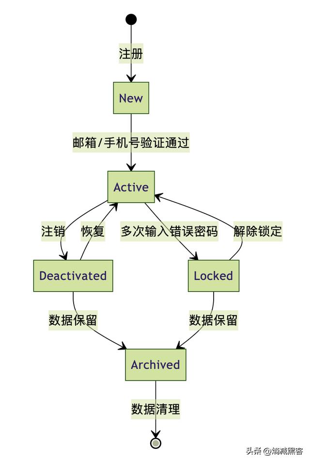 Account的state状态有:新注册,已激活,已注销,被锁定等状态,将这些状态在Mermaid脚本中描述出来,用markdown输出状态转换代码吧