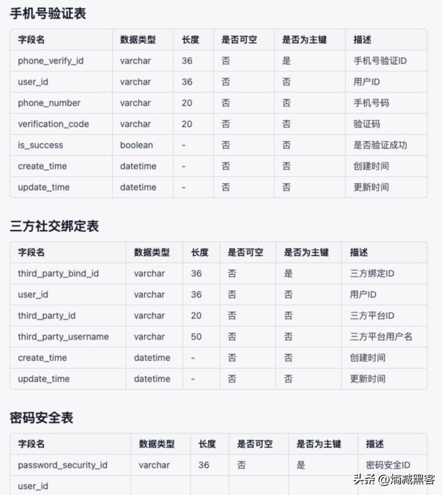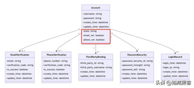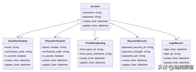 提示:我们从用户故事开始,需要设计一个网站的账号系统模型,其中包括账号基础信息实体,邮箱验证实体,手机号验证实体,三方社交绑定实体,密码安全实体,登录记录实体。