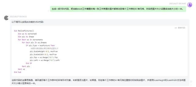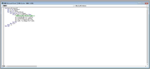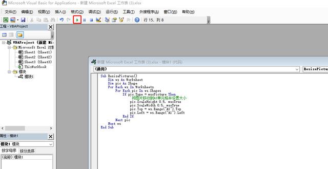 一、场景说明。把当前Excel工作簿里的每一张工作表里的图片都移动到每个工作表的A1单元格,然后把图片大小设置成当前大小的一半。