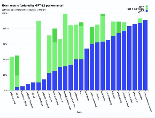 对比 GPT 3.5 和 GPT 4 的标准化测试成绩图表