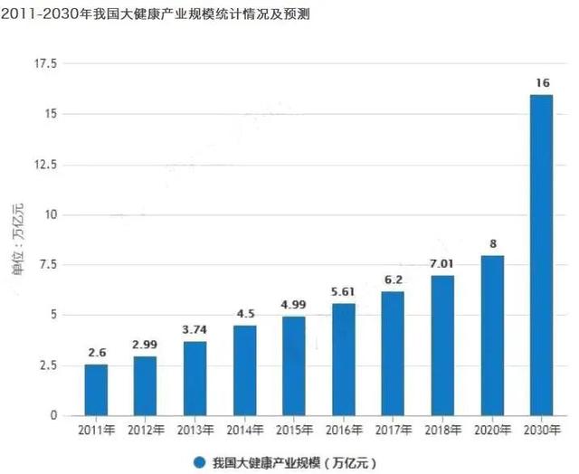 根据《健康中国2030规划纲要》,2030年,中国大健康产业市场规模有望逼近16万亿元,成为中国经济的支柱产业之一,可以类比的是,2022年,被视为经济支柱的房地产行业,开发投资总额也不过13.29万亿元。