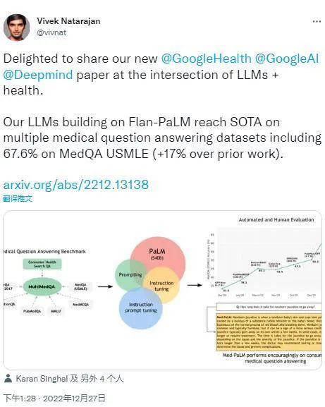 根据谷歌透露的成绩单。今年3月,比首代产品更聪明的谷歌Med-PaLM 2面世后,在医学考试中的表现处于“专家”水准,答题准确率超过85%,比前一代的结果高出18%。