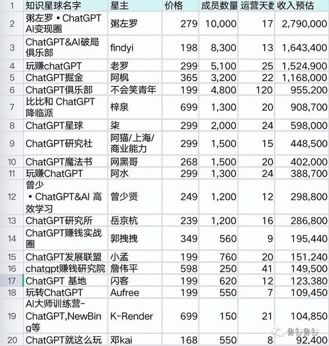 排名第二的“ChatGPT&AI破局俱乐部”,标价268星球币,3月24日开放至今已经有1.73万成员,估算有463万元收入。排名第三、第四的“玩赚ChatGPT”和“ChatGPT掘金”,标价分别为299元、365元,也分别吸引了5600个学员和3800个学员,收入均超100万元。