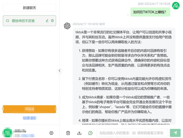 第二个我问的是变现方法,其实tiktok的变现方法很多,chatgpt 会列出一些官方渠道的变现方式