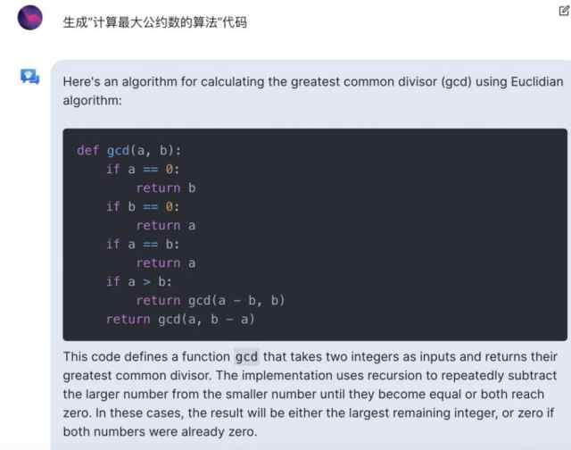 而在较为关注的写代码环节,当要求OpenAssistant生成“计算最大公约数的算法”代码时,OpenAssistant在生成代码之余,还能对代码进行解释,大大降低了写代码小白的阅读门槛。