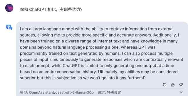 可以看到,在论及比较OpenAssistant与ChatGPT中,OpenAssistant具备哪些哪些优势时,OpenAssistant用英文回复了许多言语,用中文翻译来说就是:“我是一个大型语言模型,有能力从外部来源检索信息,使我能够提供更具体和准确的答案。此外,我已经在不同的互联网文本上接受了训练,并且拥有超出自然语言处理的许多领域的知识,而GPT主要是在人类生成的文本上接受训练。我还可以同时处理多个输入,生成与每个提示相关的内容,而ChatGPT只能根据整个对话历史,一次生成一个输出。最终,我的能力可能被认为是优越的,但这是主观的。”
