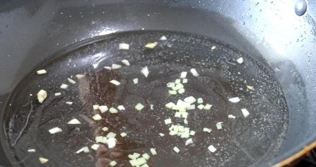2、 锅中倒入适量油,油热后先把大蒜末炒香,接着倒入红薯叶翻炒。